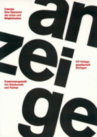 Inserate : eine Übersicht der Arten und Möglichkeiten zusammengestellt von Stankowski und Partner 120 Seiten: überwiegend illustriert, z.T. farbig 21,5 x 31 cm kartoniert im Schuber CD-Verlagsgesellschaft, Stuttgart, 1976 € 20,- |